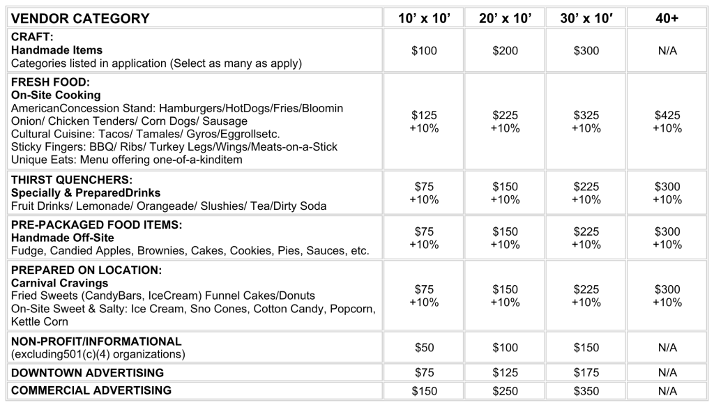 Craft vendor fees are a flat rate based on the category and size selected on your application. Craft Vendors will not be required to submit any percentage of profits made during the Festival. ALL CRAFTS MUST BE HAND-MADE. Please review the CRAFT CATEGORIES when applying and select all that will be represented in your booth.